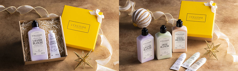 ロクシタンのベストセラー・ボディトリートメント「リラクシング アロマエコロジー トリートメント」に、トリートメント中に使用するボディミルクと、同フレグランスのハンドクリームをセットにしたクリスマスギフトボックス付きプラン