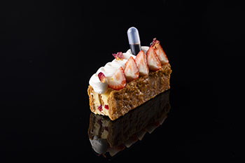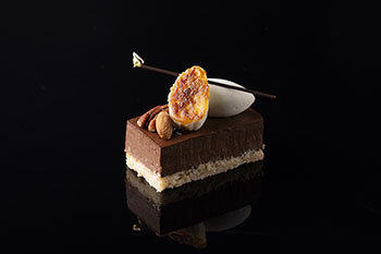 キルシュが香るクリームムースリーヌとベリージャムを重ねたミルフィーユに、マスカルポーネクリームとピンクグレープフルーツのソースを添え、ドライローズで華やかに仕上げた一品。