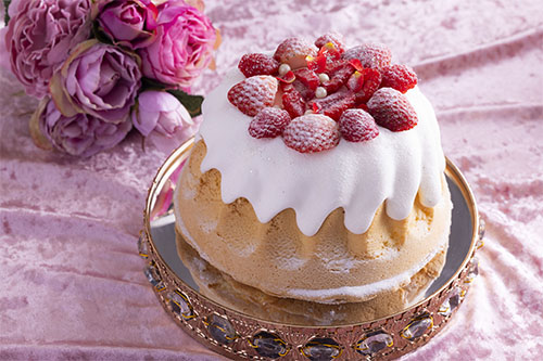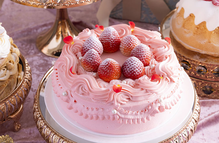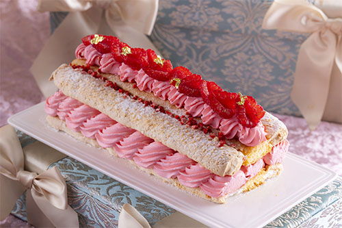 軽やかなスポンジにオレンジリキュールを忍ばせ、まるでマリー・アントワネットのドレスのように華やかなショートケーキ。フレッシュ苺をサンドし、生クリームにも苺を用いた気品あふれる一品。
