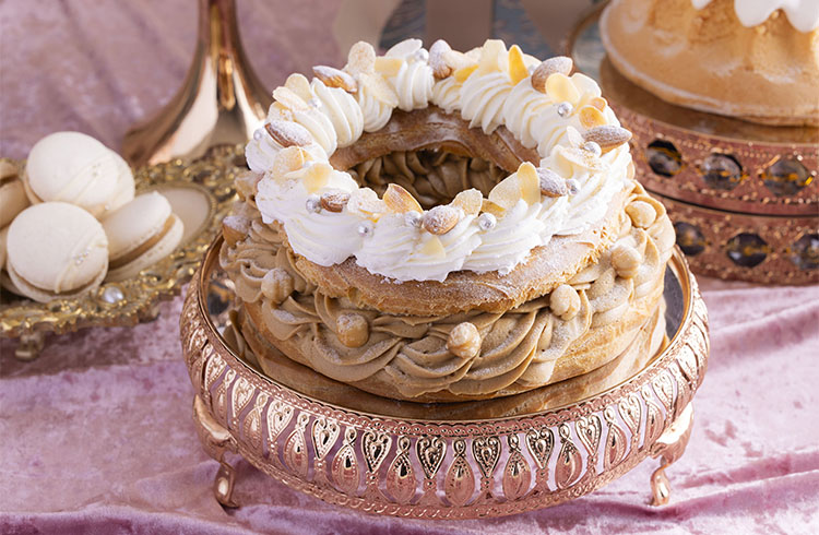 香ばしく焼き上げたシュー生地に、コクのあるコーヒーバタークリームを絞り、大人の味に仕上げました。生クリームとナッツをあしらい、王妃の王冠をイメージしました。