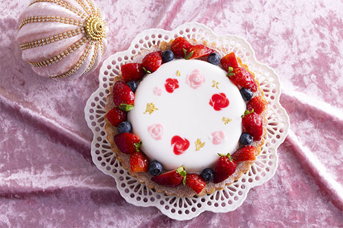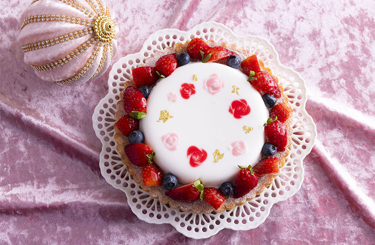 ヴェルサイユ宮殿の庭園に咲く薔薇を思わせる華やかなデコレーションが目を引くタルト。甘酸っぱいストロベリームースをアーモンドタルトに重ね、フルーティーで華やかに仕上げました。