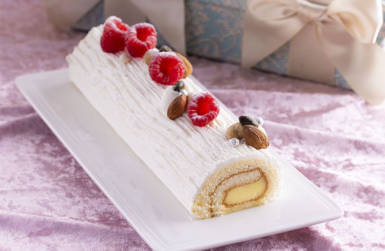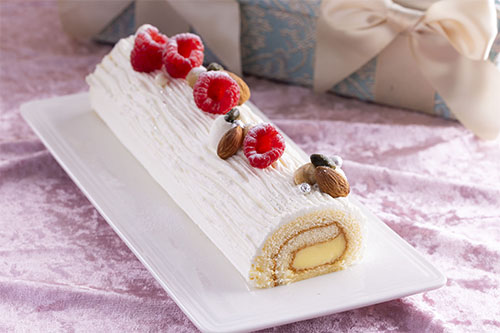 雪が積もった木々をイメージし、クリームで美しく仕上げたクリスマスの伝統菓子“ブッシュ・ド・ノエル”