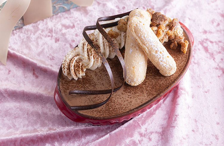 軽やかな口どけのチョコレートムースに、フィンガービスケットを添えて。ほろ苦さと甘さが重なり合い、大人のためのクラシックデザートです。