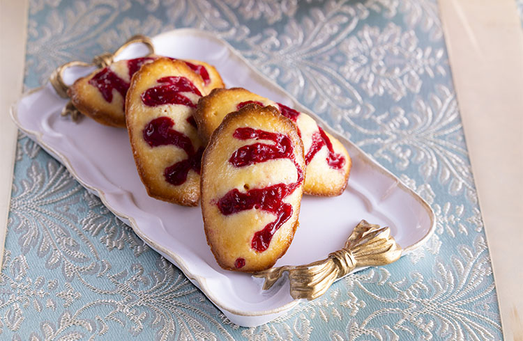 ココナッツ風味のマドレーヌに、甘酸っぱいラズベリージャムをのせて焼き上げました。仕上げに粉糖をふりかけ、まるで雪のような繊細な輝きを演出しました。