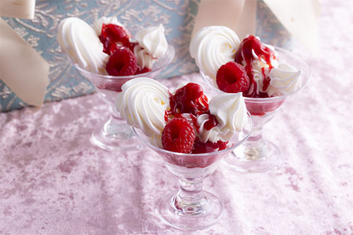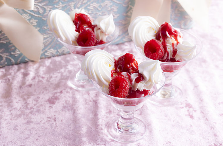サクサクと軽やかなメレンゲに、甘酸っぱいベリーとグリオットチェリーのソースを重ねた、華やかなアイスパフェ。