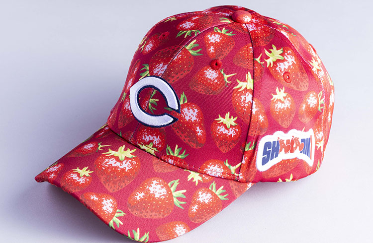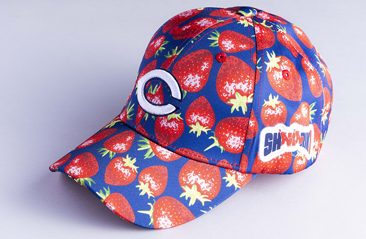 ベースボールキャップは、昨年好評だった全面いちご柄デザインが、広島東洋カープの2026年キャッチフレーズ「SHAKARIKI」ロゴ入りとして各色100個限定で再登場!
