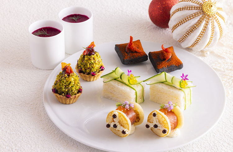 “白銀の世界で楽しむ優雅なアフタヌーンティー”をテーマとし、赤・緑・白のクリスマスカラーを取り入れた、まるでオーナメントのように煌めく愛らしいスイーツ9種類をご用意しました。さらに「ゴートチーズのクリスマスツリーテリーヌ」や「ポーチドチキンのクリスマスギフトサンドイッチ」など、シェフが腕を振るう5種類のセイヴォリーがテーブルを華やかに彩ります。