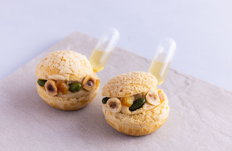 アーモンドやヘーゼルナッツのプラリネカスタードクリームにアプリコットとオレンジのジャムをそっと忍ばせたシュークリーム