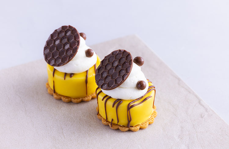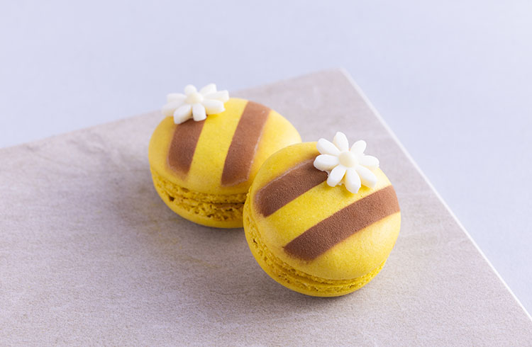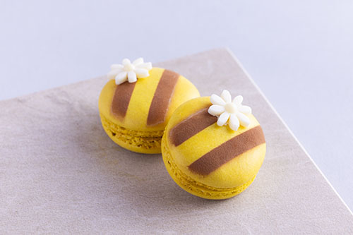 ハチの模様をイメージした可愛らしいデザインのレモンとパッションフルーツの爽やかな口どけのガナッシュをサンドしたマカロン