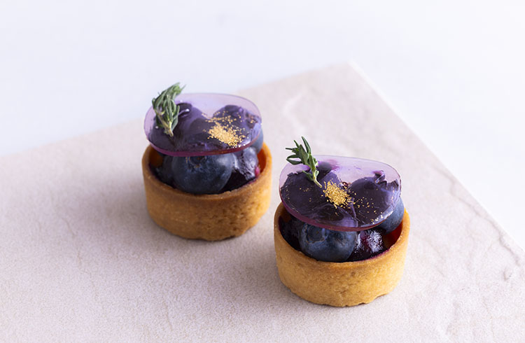 華やかな香り立つスミレのジュレをまとった、みずみずしいフレッシュブルーベリータルト