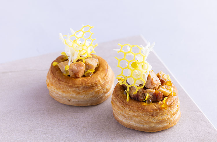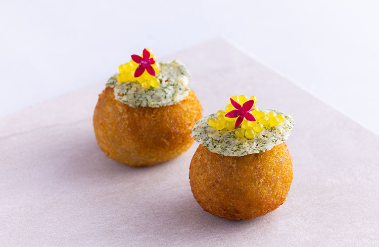 ハーブパルメザンポテトクリスプとオレンジハニーキャビアをあしらったゆっくりじっくり揚げたビーフコロッケ