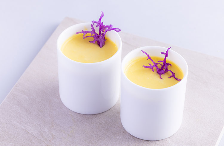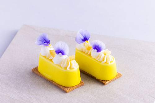 鮮やかなイエローとパープルのエディブルフラワーが春を感じさせる瀬戸内レモンのまろやかな酸味を生かしたムース