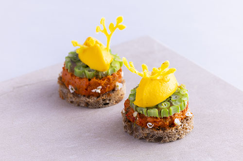 甘酸っぱく爽やかなマンゴーチャツネをアクセントに効かせた、サフランの上品な香りをほんのりまとわせたフィッシュテリーヌのサンドイッチ