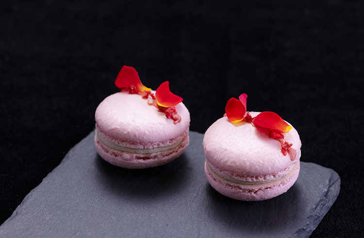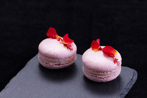 苺とバジルのガナッシュをサンドした、薔薇をあしらったまるで王女のドレスを思わせる可憐なピンクのマカロン