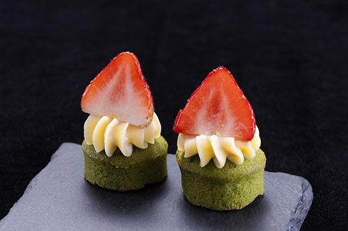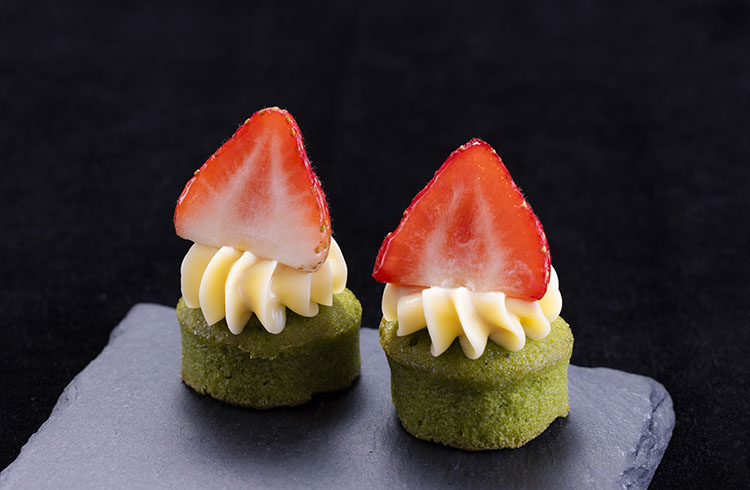 しっとりと焼き上げた抹茶のフィナンシェに香り高い酸味の柚子クリームとフレッシュ苺を載せた一品