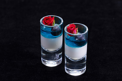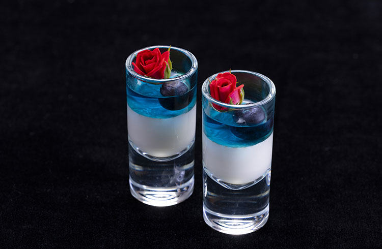 鮮やかなバタフライピーのジュレとブルーベリーを添えた濃厚なバニラのパンナコッタ