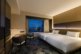 広島市内を一望できるシティービューのお部屋と宮島や瀬戸内海を望むオーシャンビューのお部屋をご用意しています。落ち着いたライトベージュを基調に、瀬戸内海をイメージしたブルーがアクセントになったお部屋でワンランク上のご滞在をお楽しみいただけます。全室55インチの大型テレビ、Wifiを完備しています。